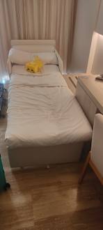 ZimmerBeistellbett am Fußende ist der Kühlschrank wenn man ran möchte musste man das Bett verschieben. Aber dann kann keiner mehr durch gehen.