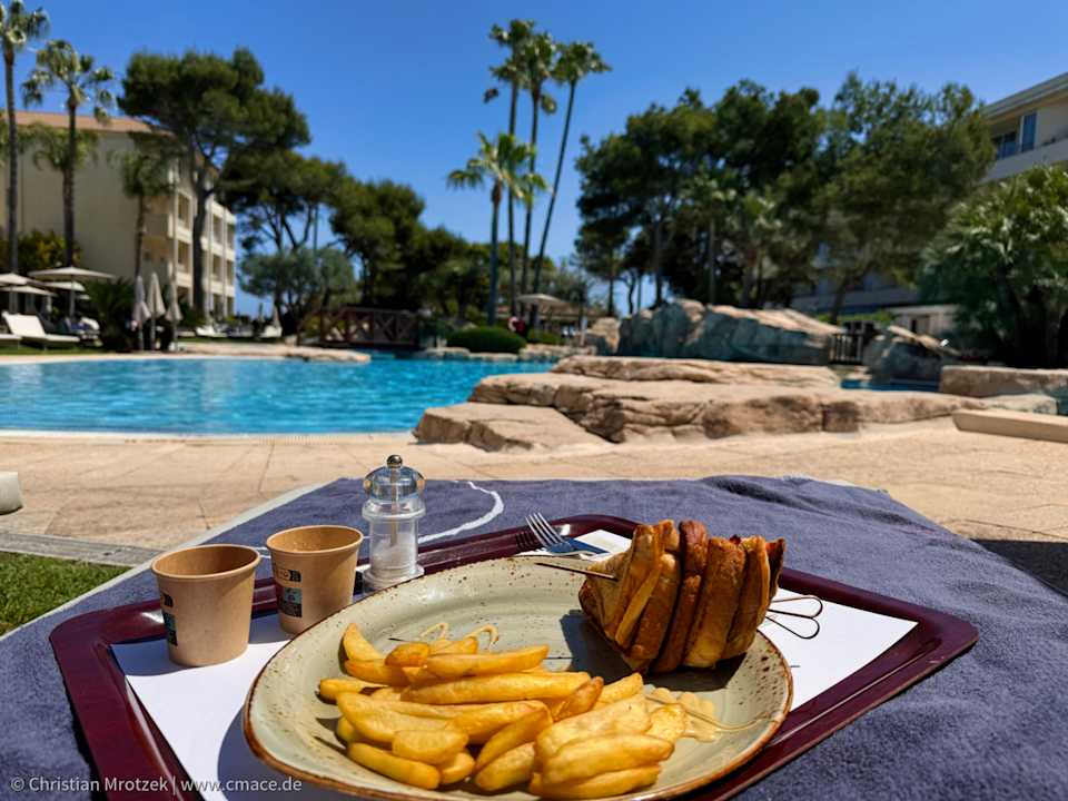Im Grupotel Parc Natural & Spa kann man sich kulinarisch verwöhnen lassen: Hier wurde ein frisch zubereiteter Snack – Sandwich und Pommes – direkt an die Poolliege serviert. Mit Blick auf die großzügige Poollandschaft.