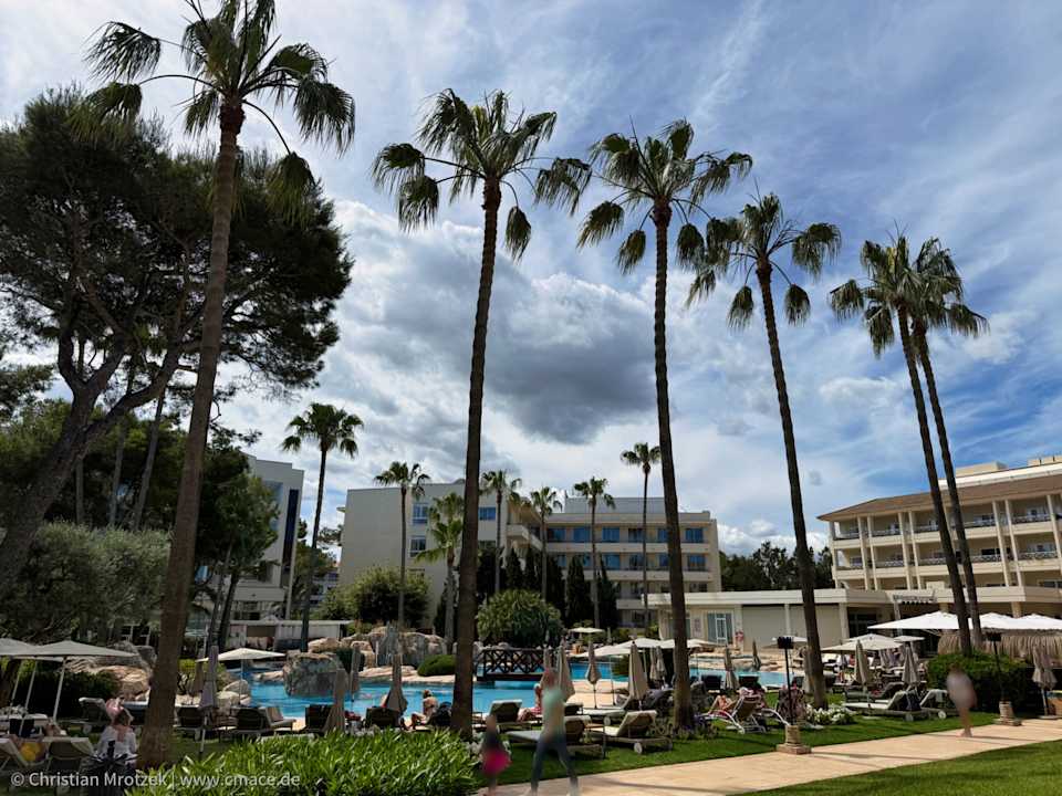 Die weitläufige Poolanlage des Grupotel Parc Natural & Spa ist von imposanten Palmen umgeben und lädt mit zahlreichen Liegen, Sonnenschirmen und mediterranem Flair zum Entspannen ein.