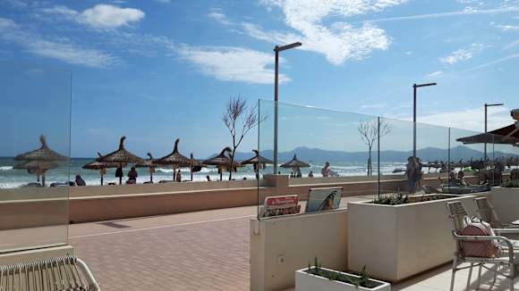Ausblick von Außenterasse über Promenade und Strand aufs Meer