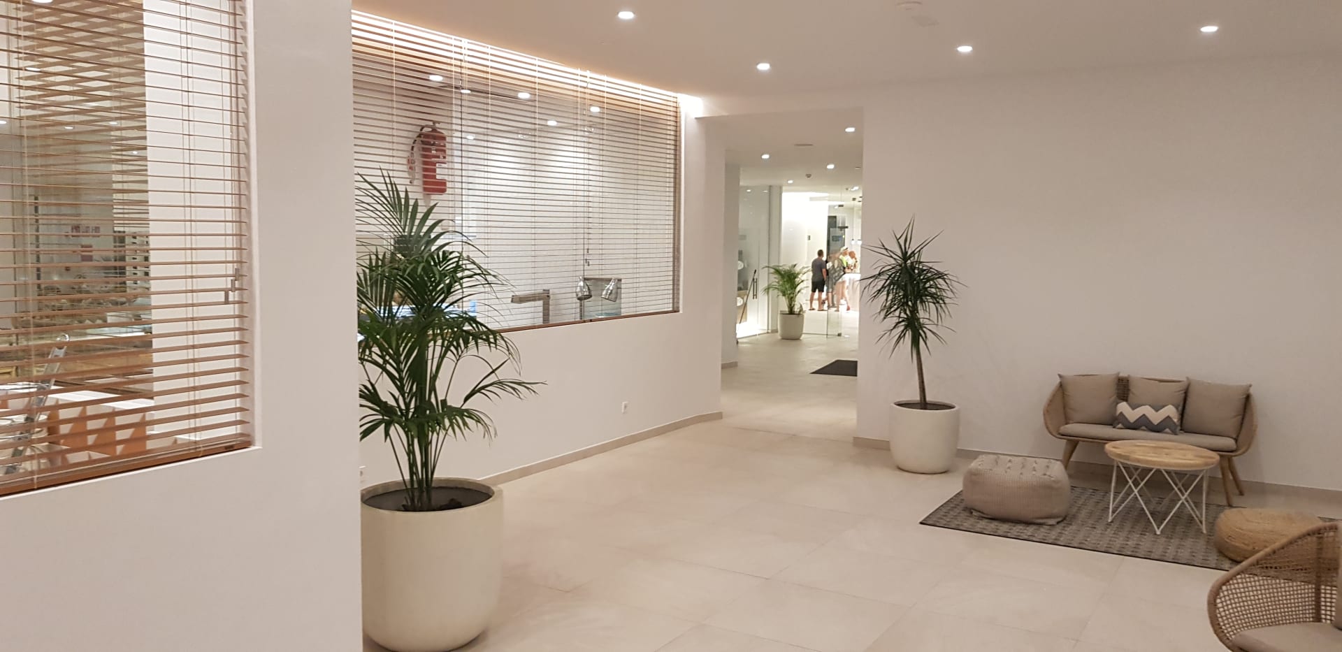 Flur von der Rezeption zur Bar. Links der Speisesaal hinter den Lamellen.