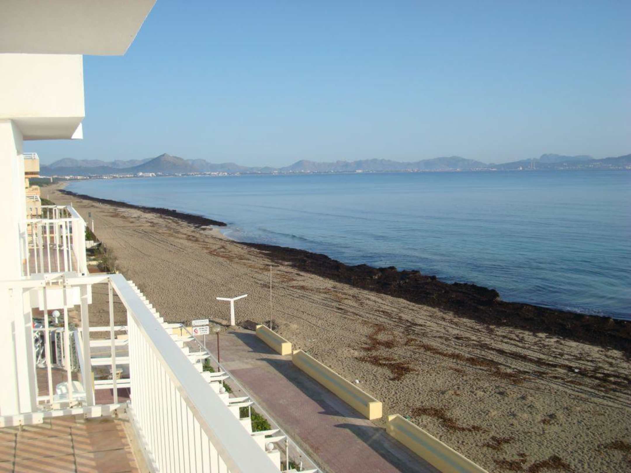 Blick nach links zum Strand vom Balkon des Appartements 330