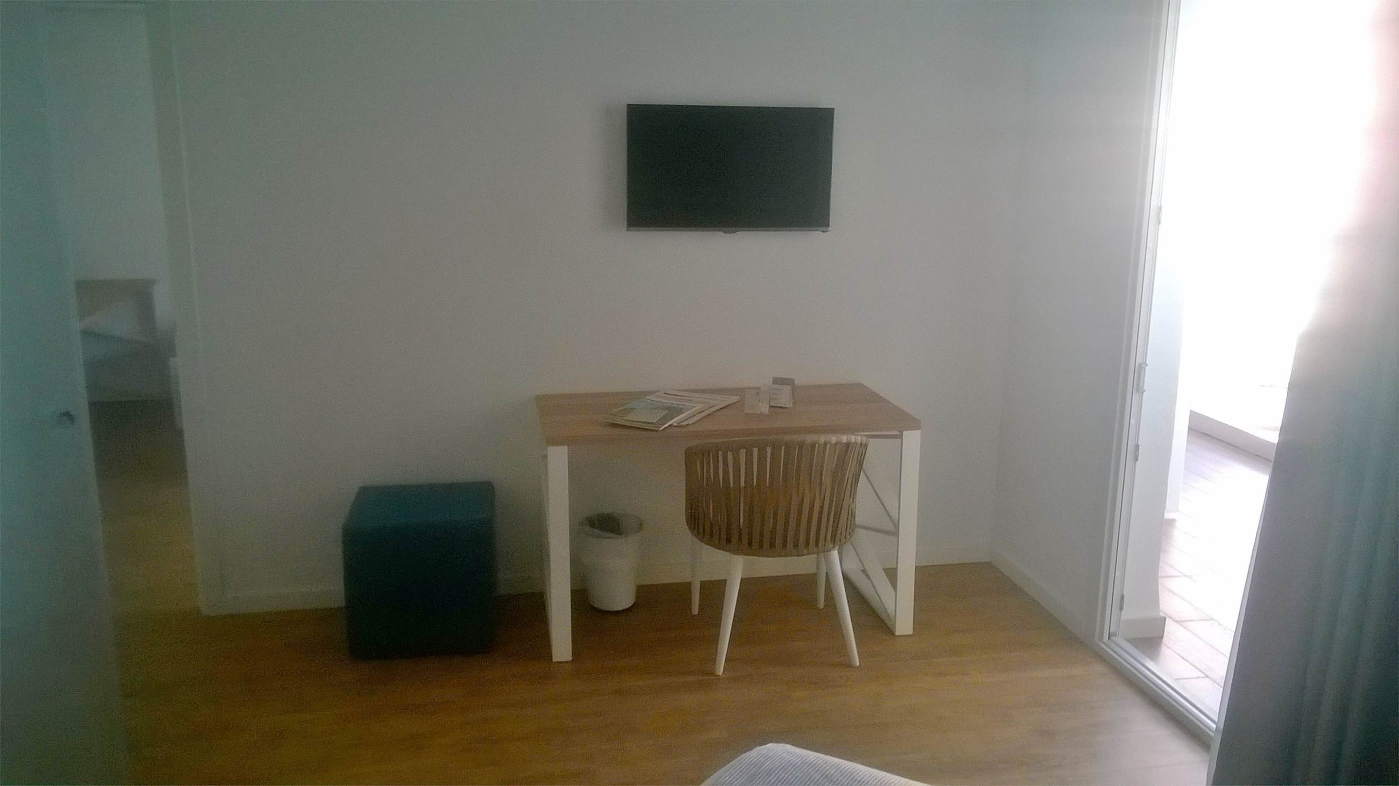 Schreibtisch mit Fernseher im Schlafraum, als Ablage der Badutensilien genutzt