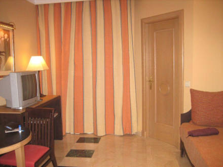 WohnkücheBlick von der Eingangstür, von links: Tisch und Stuhl, Regal mit TV, Balkontür, Tür zum Schlafzimmer, Schlafcouch