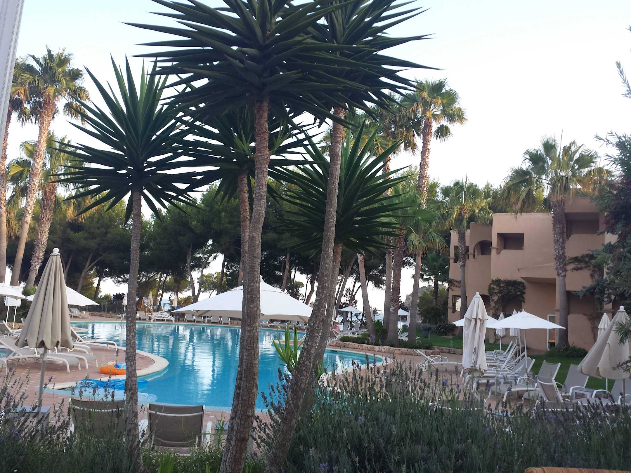 Blick auf den Pool von der Terrasse am Hotel