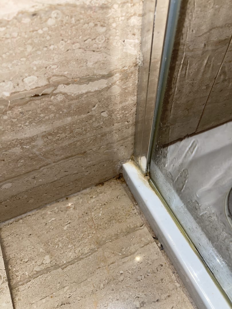 Fugen und Dichtungen an der Dusche im Bad. Voll mit Schimmel etc