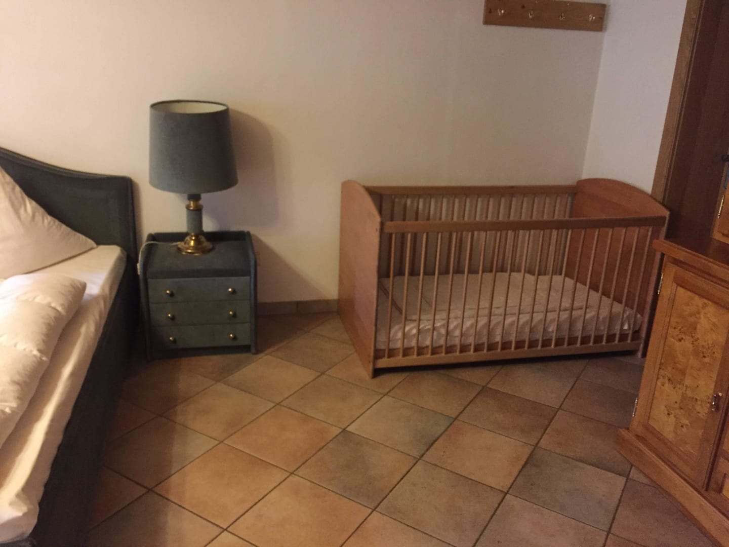 Eines der Doppelzimmer mit Babybett