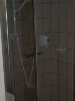 Die Dusche hat nur einen ganz einfachen Duschkopf, den Strahl kann man nicht verstellen!