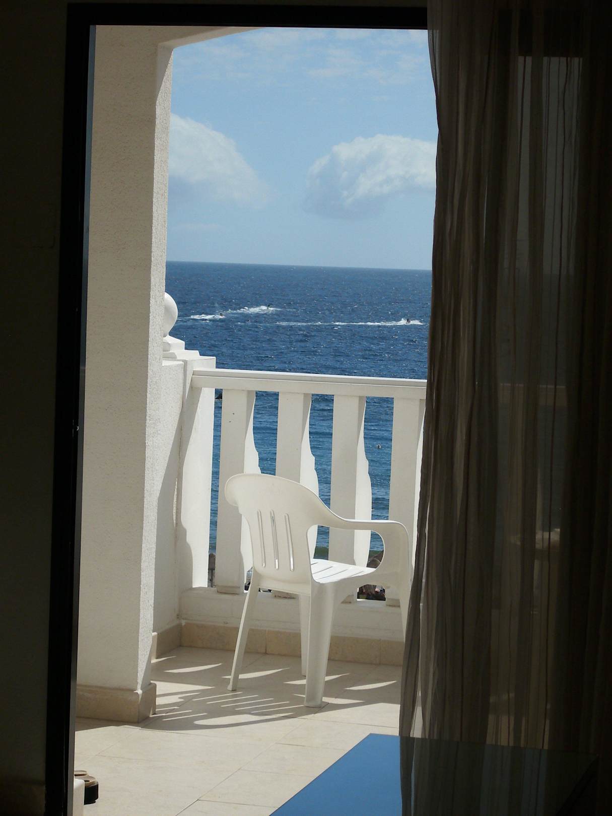 Blick vom Bett auf den Balkon und das Meer