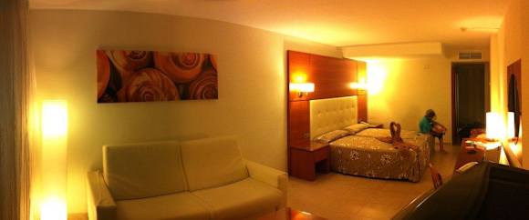 Panoramblick ins Zimmer vom Balkon aus, vorn das Zustellbett / Couch und hinten ein Doppelbett