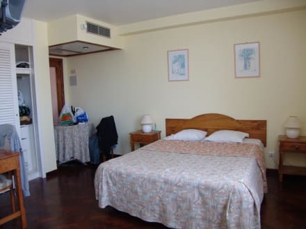 Zu erkennen: Wandschrank, Tisch mit Stühlen, Doppelbett; etwas links im Bild Schreibtisch und Stuhl; oben darüber der TV; hinter dem Fotografen und nicht im Bild zu sehen; 2-Sitzer-Couch mit Tisch und Sessel.