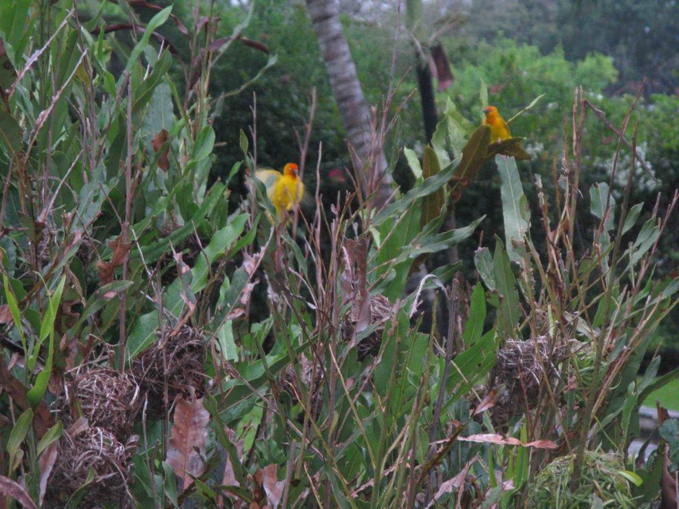 Webervögel mit Nestern im Garten