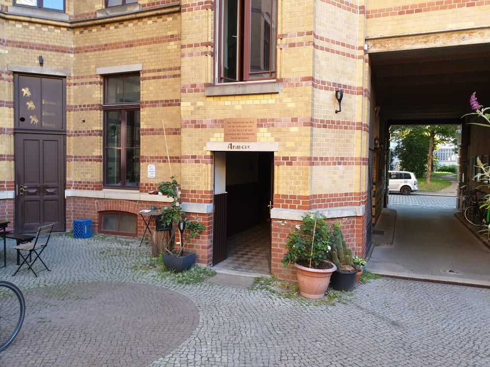 Blick vom Innenhof auf den Duchgang zum Hotel, den Eingang zum Treppenhaus im Amadeus-Gebäude (zu den Doppelzimmern Economy) und der Kneipe (ganz links)