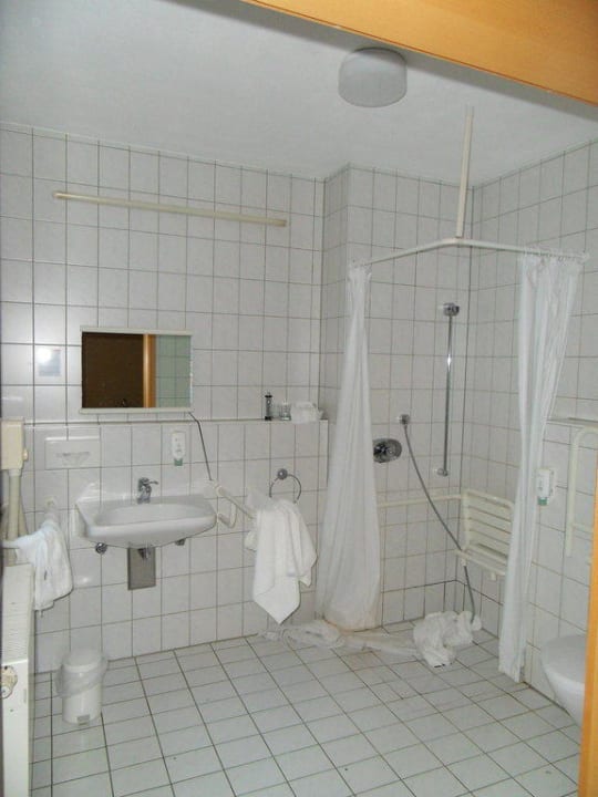 Das behindertengerechte Badezimmer mit (unten) schimmeligen Vorhang.