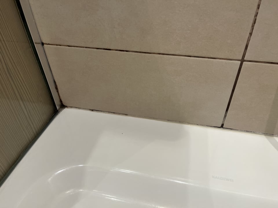 ZimmerBesagter geringfügiger Sanierungsstau im Bad, hier: stärker verschimmelte Silikon sowie reguläre Fliesenfugen.