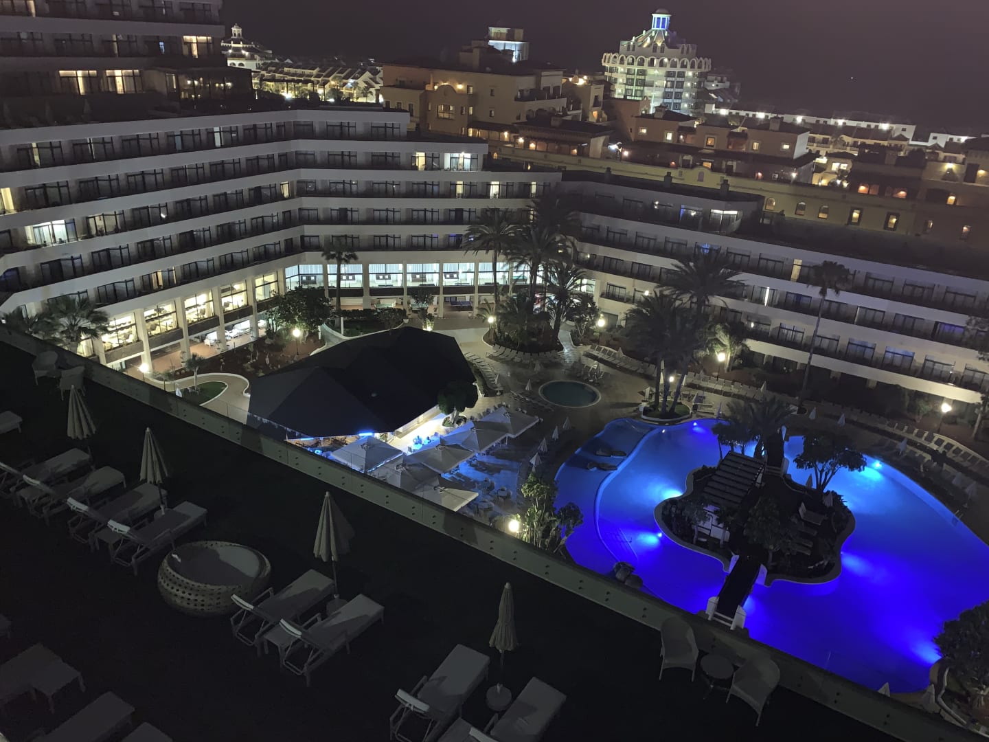 AußenansichtAus der 8. Etage (Zimmer 823) mit Blick auf das Hotel und die Poollandschaft (im Vordergrund die Privilegedachterasse), am Abend