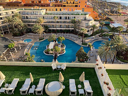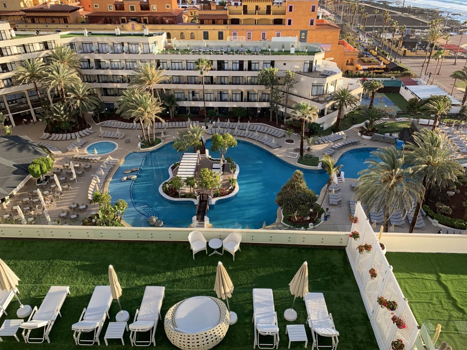 Aus der 8. Etage (Zimmer 823) mit Blick auf die Poollandschaft des Hotels mit Privilegesonneninsel (im Vordergrund die Privilegedachterasse), am Tag
