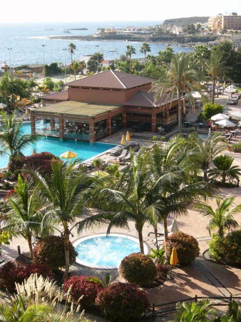 ...auf die Poolanlage und die Bucht von La Caleta