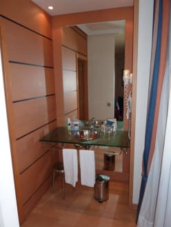 Waschbecken außerhalb des Bades und im hinteren Teil des Zimmers