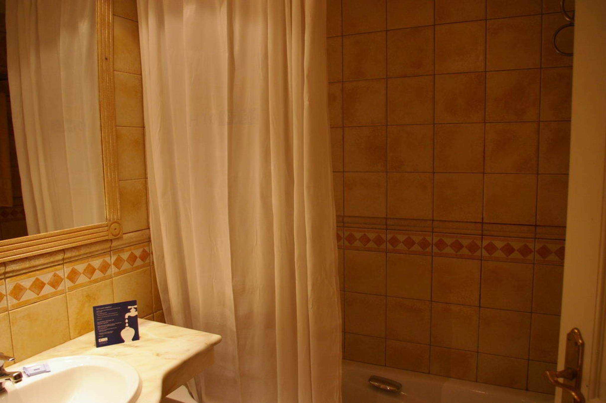 Links Waschbecken, Badewanne dahinter