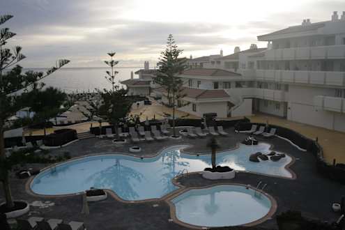 Ausblick von meinem Zimmer auf Poollandschaft und Meer.