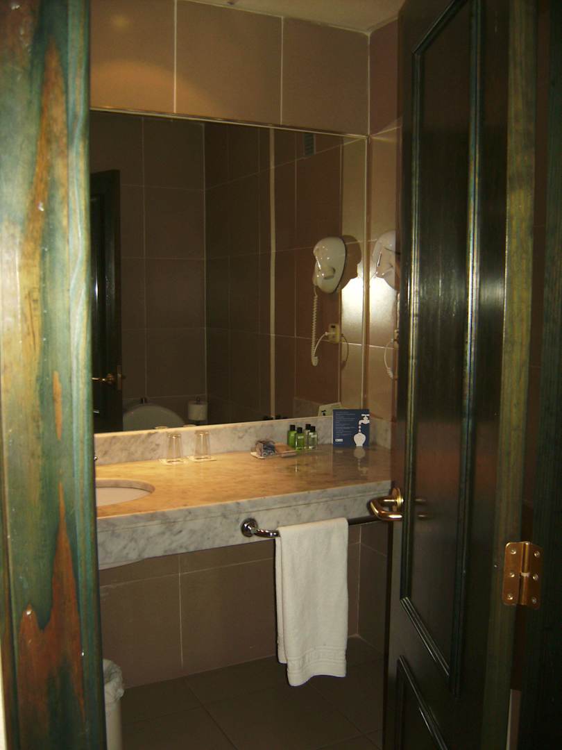 Bad mit Waschbecken, Spiegel und Fön