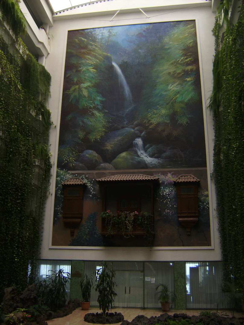 Blick auf Wandbild, unten Eingang zum Restaurant