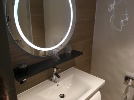 Bad mit Waschbecken und Spiegel