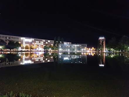 Blick auf das Hotel vom Messe-See am Abend