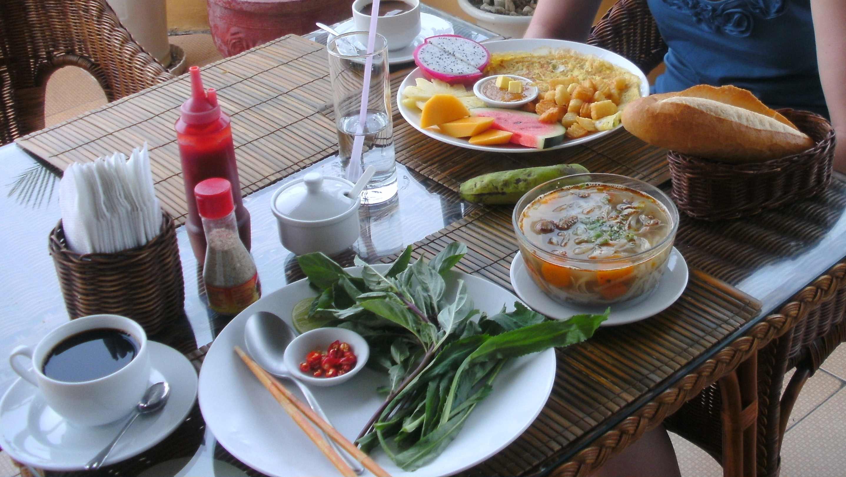 1x Omlett mit Kartoffeln und Obst und 1x vietnamesisches Frühstück - Suppe
