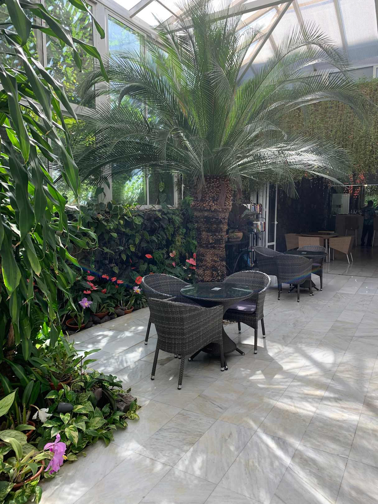 Super gemütliche Lobby voller Pflanzen.
