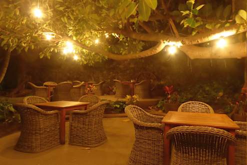 Frühstücken und Abendessen unter dem Ficus...