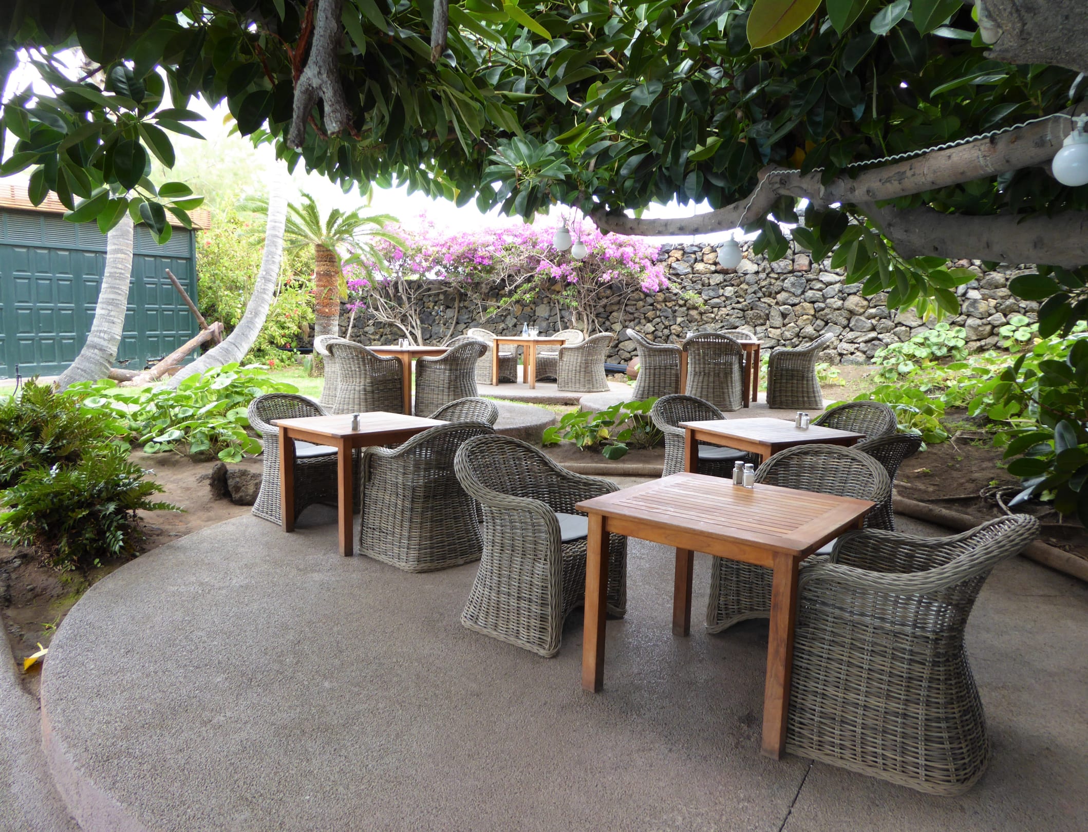 GastroRestaurant-Seitenterrasse mit 6 besonders bequemen Tischen (n.n. eingedeckt) und Stühlen unter riesigem Gummibaum