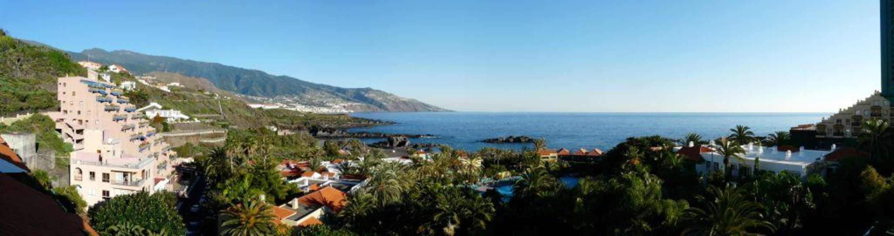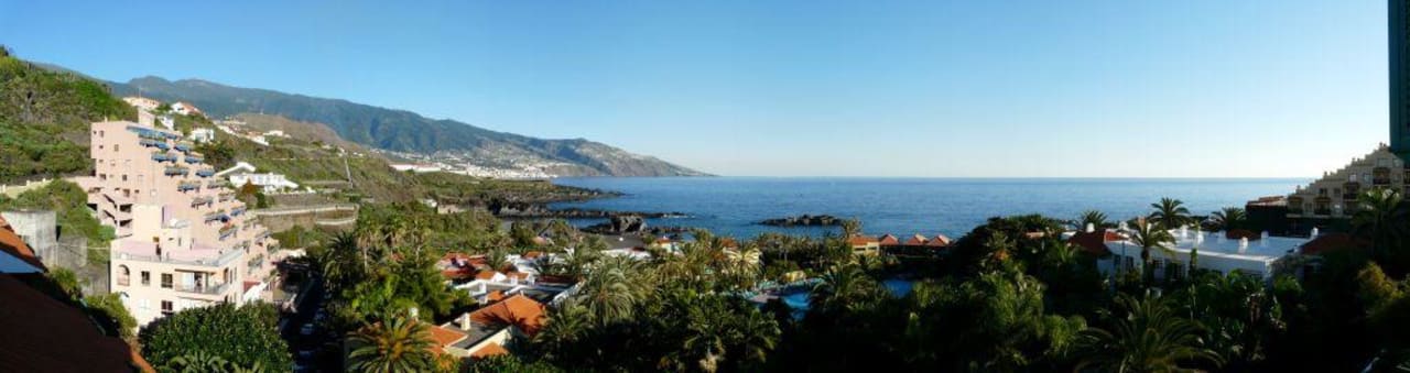 Blick über die Gartenanlage in Richtung Meer vom Dach des Hauptgebäudes (Block C, 6. Etage). Links ist die Hauptstadt Santa Cruz zu erkennen.