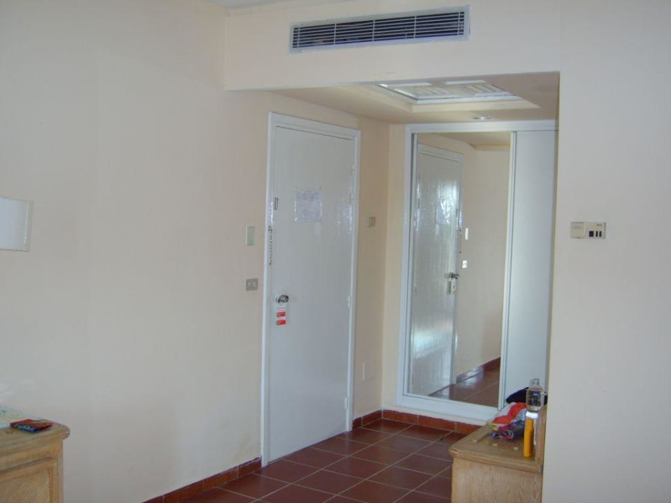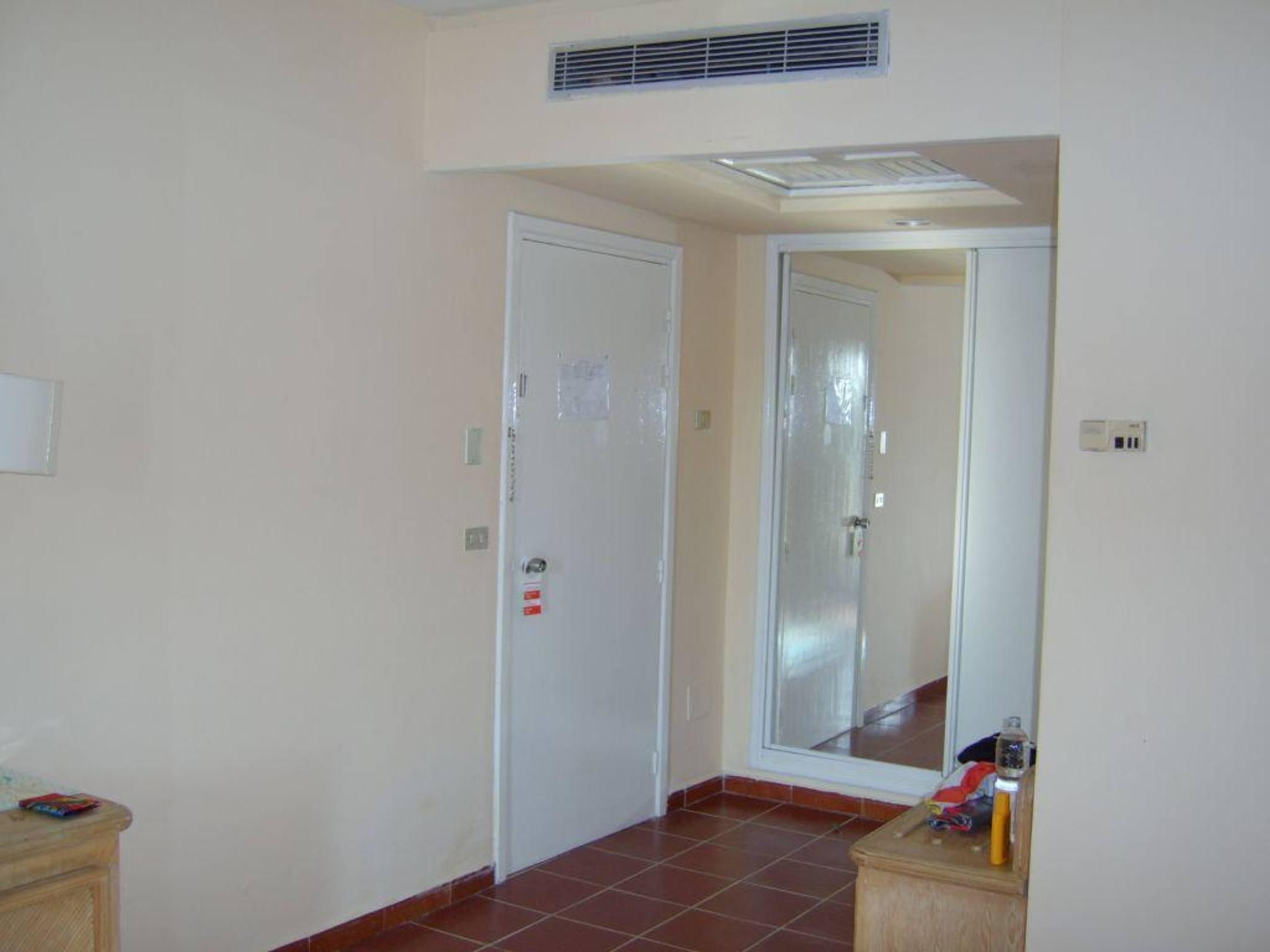 ZimmerLinks der Eingang und hinter dem Spiegel ist der Wandschrank groß genug für 2 Personen. Oben sieht man die Klimaanlage.