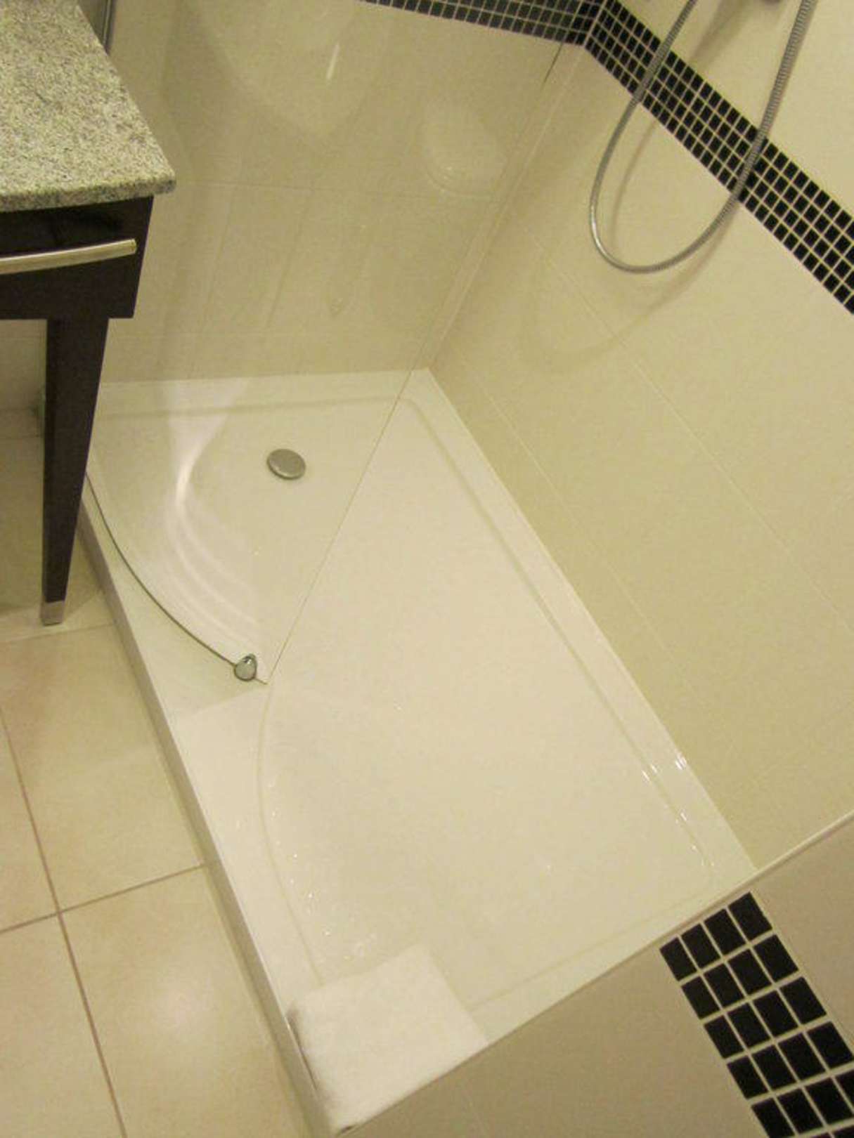 Eine sehr große Duschkabine zu ebener Erde. Trotz intensivem Gebrauch lief kein Wasser ins restliche Badezimmer hinein. Die Abtrennung war eine elegant gebogene Glasscheibe.