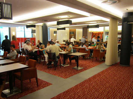 Gute Einrichtung. Aber es kam wegen der kompletten Selbstbedienung und der orange farbenen Tabletts ein Hauch von Kantinen-Atmosphäre auf.