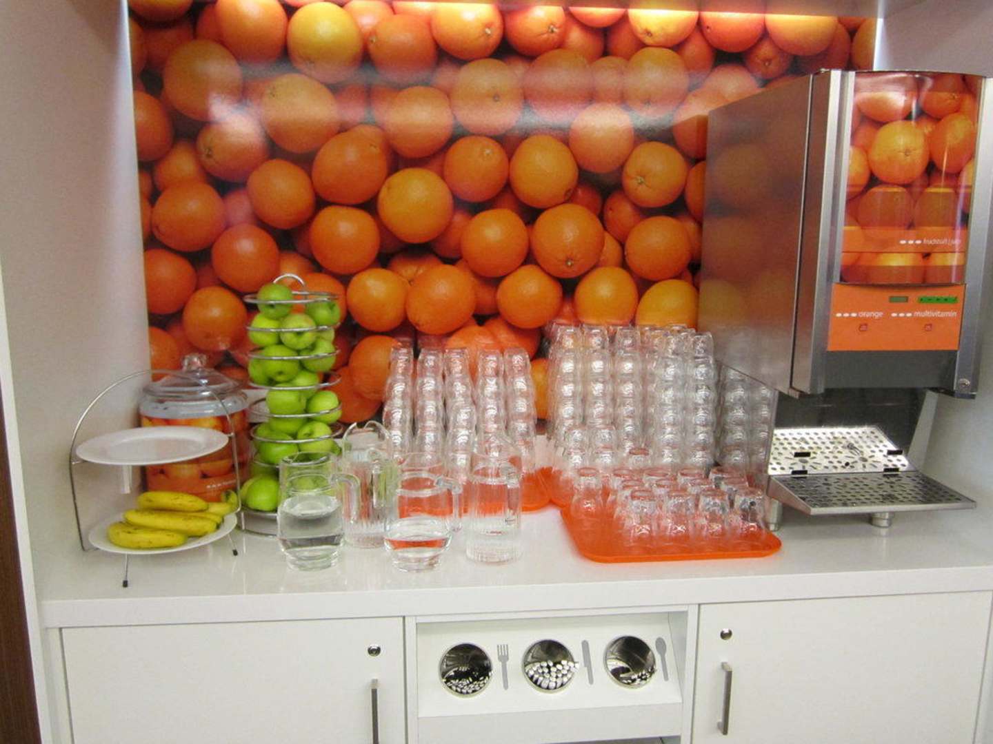 Es gab Orangen, Bananen und Äpfel. Dazu dann als Kaltgetränk Wasser und zwei verschiedene Säfte. Die Heißgetränke waren an einer anderen Theke aufgebaut.