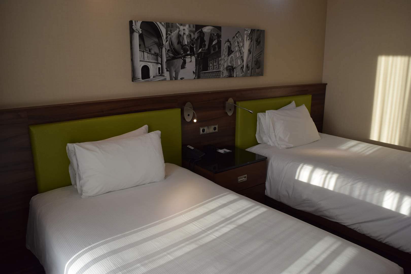 Zwei Betten. Jeweils von ordentlicher Breite und mit zwei Kopfkissen. Offiziell für bis zu vier Personen gedacht. Mehrere Steckdosen direkt in Nähe vom Bett.