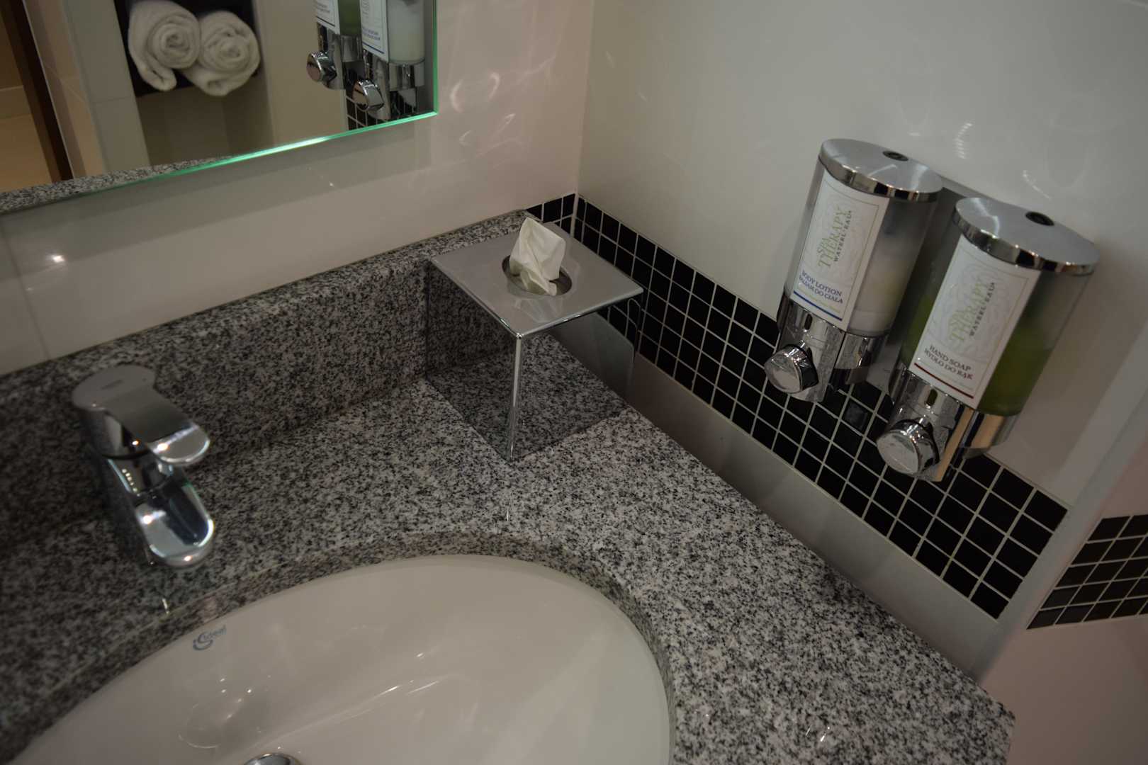 Waschtisch im Bad. Wasch- und Body-Lotion in Spendern