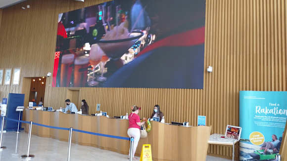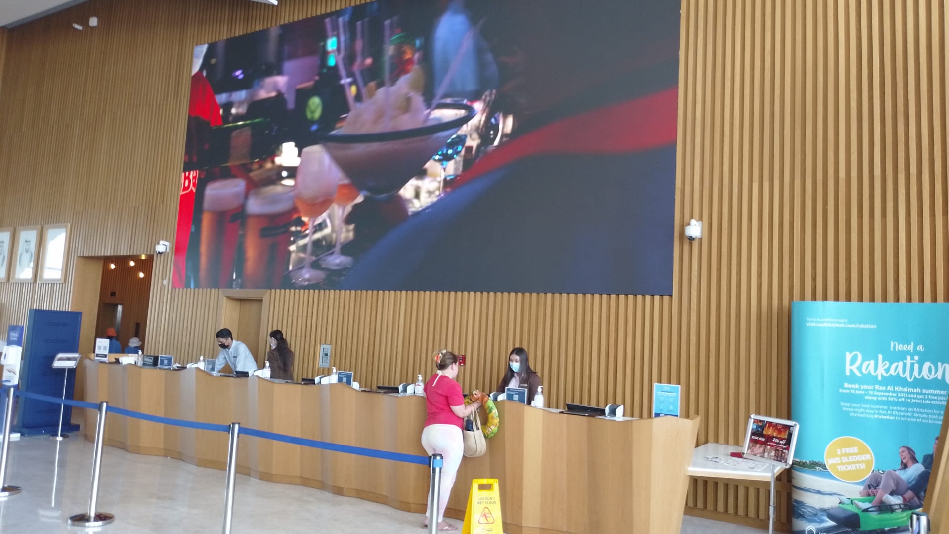 Blick zur Rezeption mit gigantischen Bildschirm und endlos Schleife.