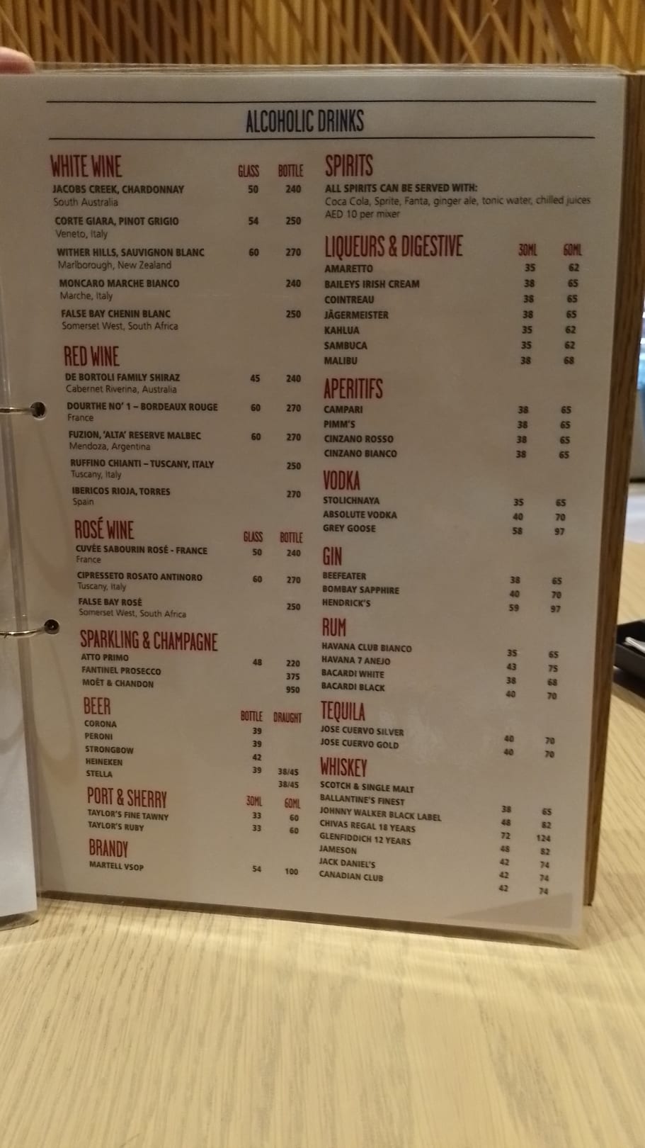 Preisliste an der Lobbybar.
