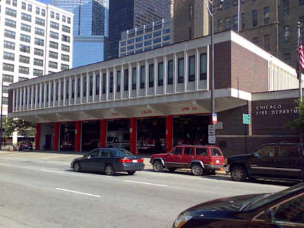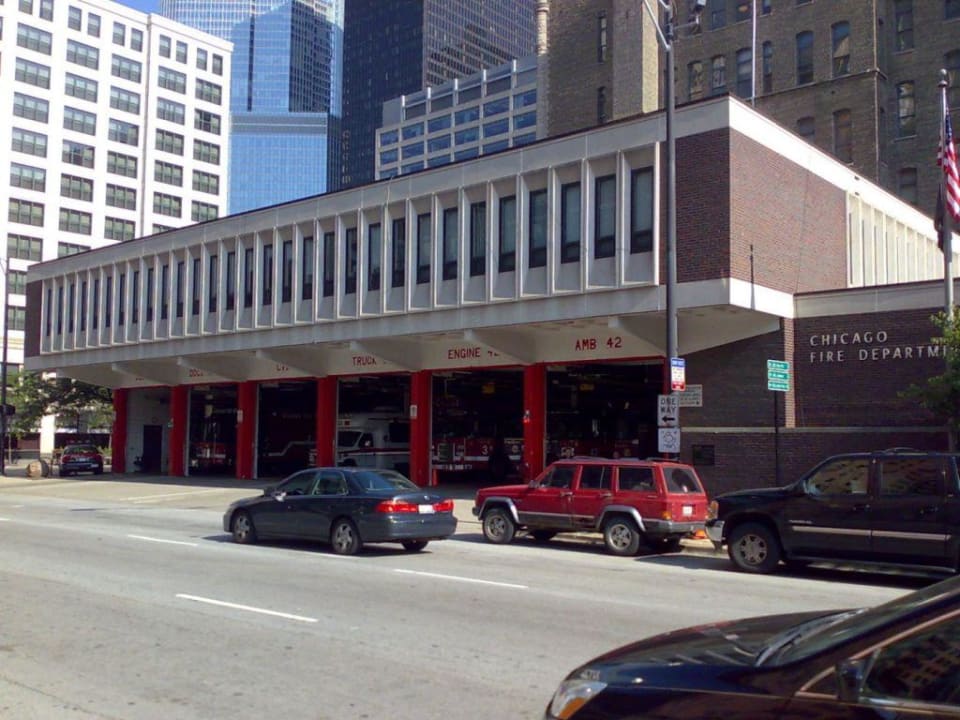 The fire brigade station next to the hotelThe white building on the left side of the image is the Hampton Inn!
