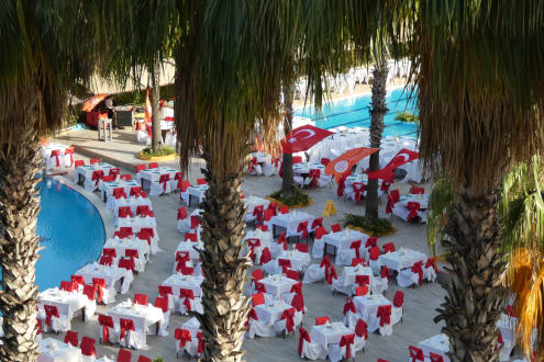 Ein Blick auf den eingedeckten Poolbereich am Gala Abend