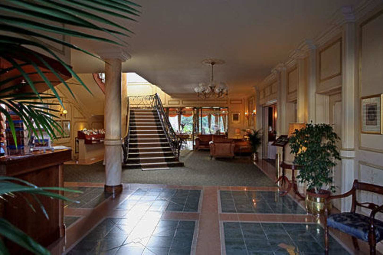 Die Lobby erstrahlt in gediegenem Ambiente. Eine geschwungene Treppe führt nach oben und Bilder zieren die Wände. Ein Sofa aus Straussenleder weilt zum Verweilen ein.