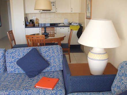 Dieses Foto zeigt einen weiteren Ausschnitt vom Wohnzimmer samt Kochnische im Hintergrund von Appartement 506 der Hapimag-Anlage Marbella.