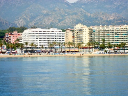 Hapimag Resort (links im Bild,weißes Gebäude) vom Meer aus gesehen.