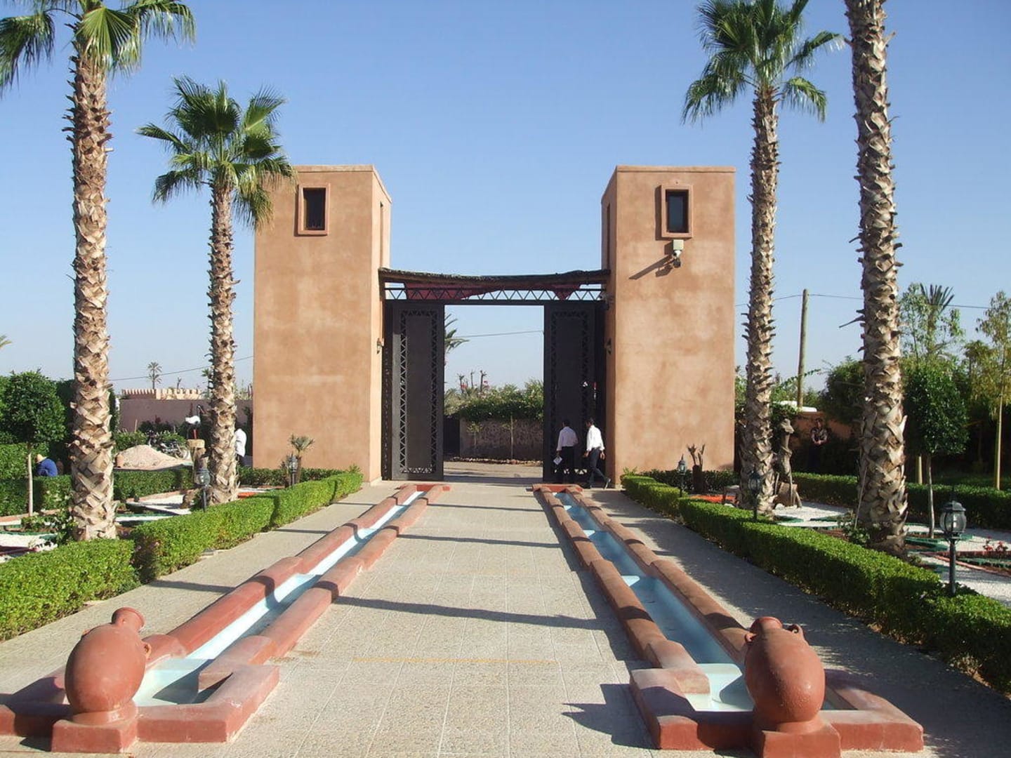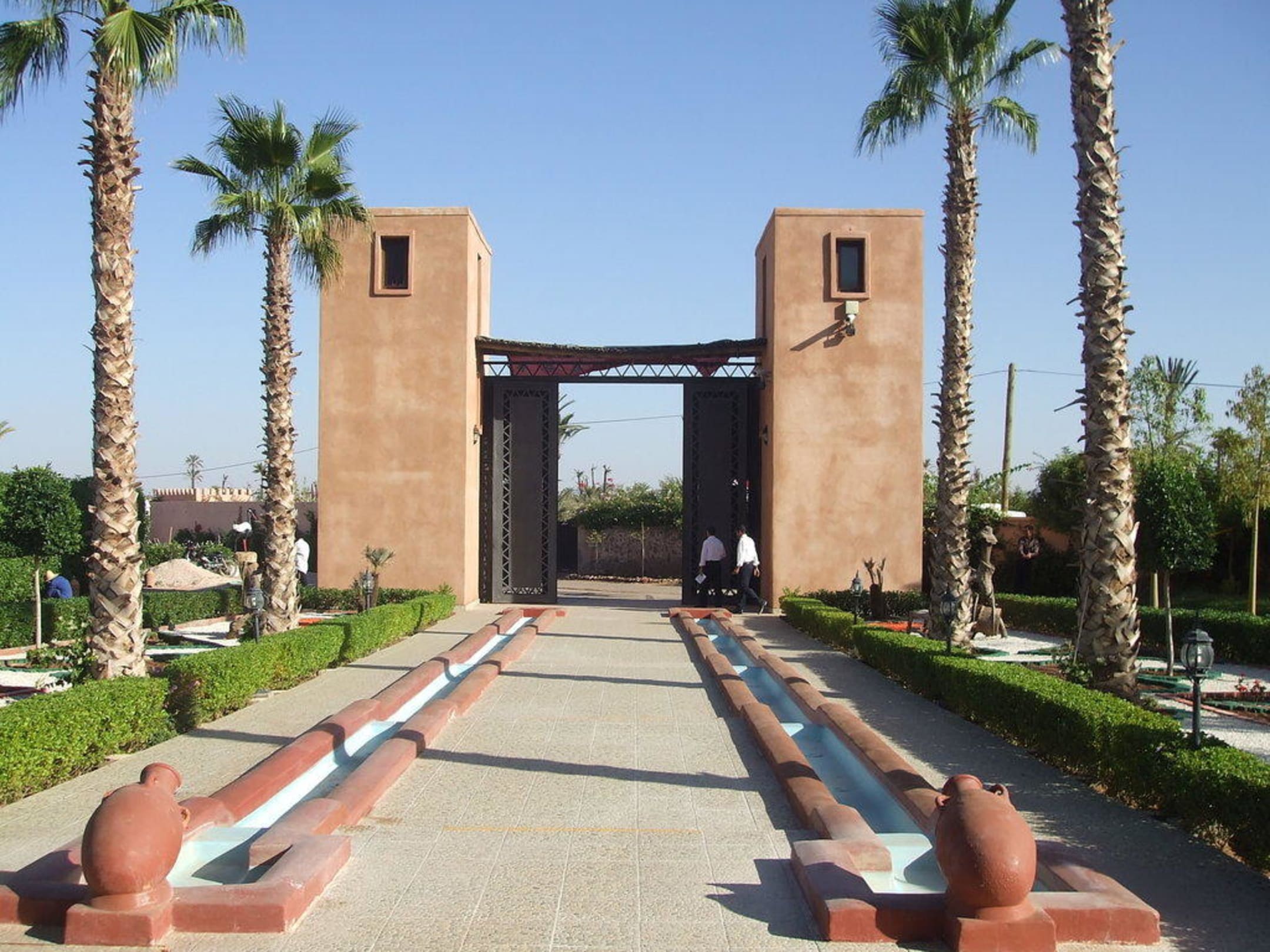 Diese Aufnahme zeigt im Hintergrund das Tor zur Hapimag-Anlage Marrakesch und davor den Weg sowie die Gartenanlagen, die zum Verwaltungs- und Wohntrakt hinführen.
