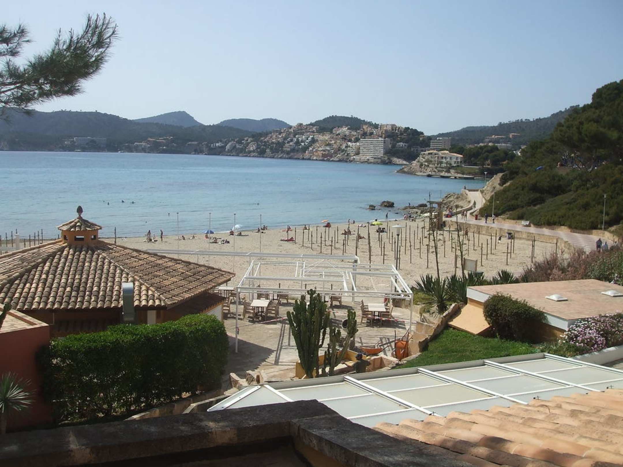 Dieses Foto zeigt einen Blick auf den Strand in der Romana-Bucht vor dem Hapimag Resort Paguera. Links das Dach vom Strandrestaurant Sotavento.