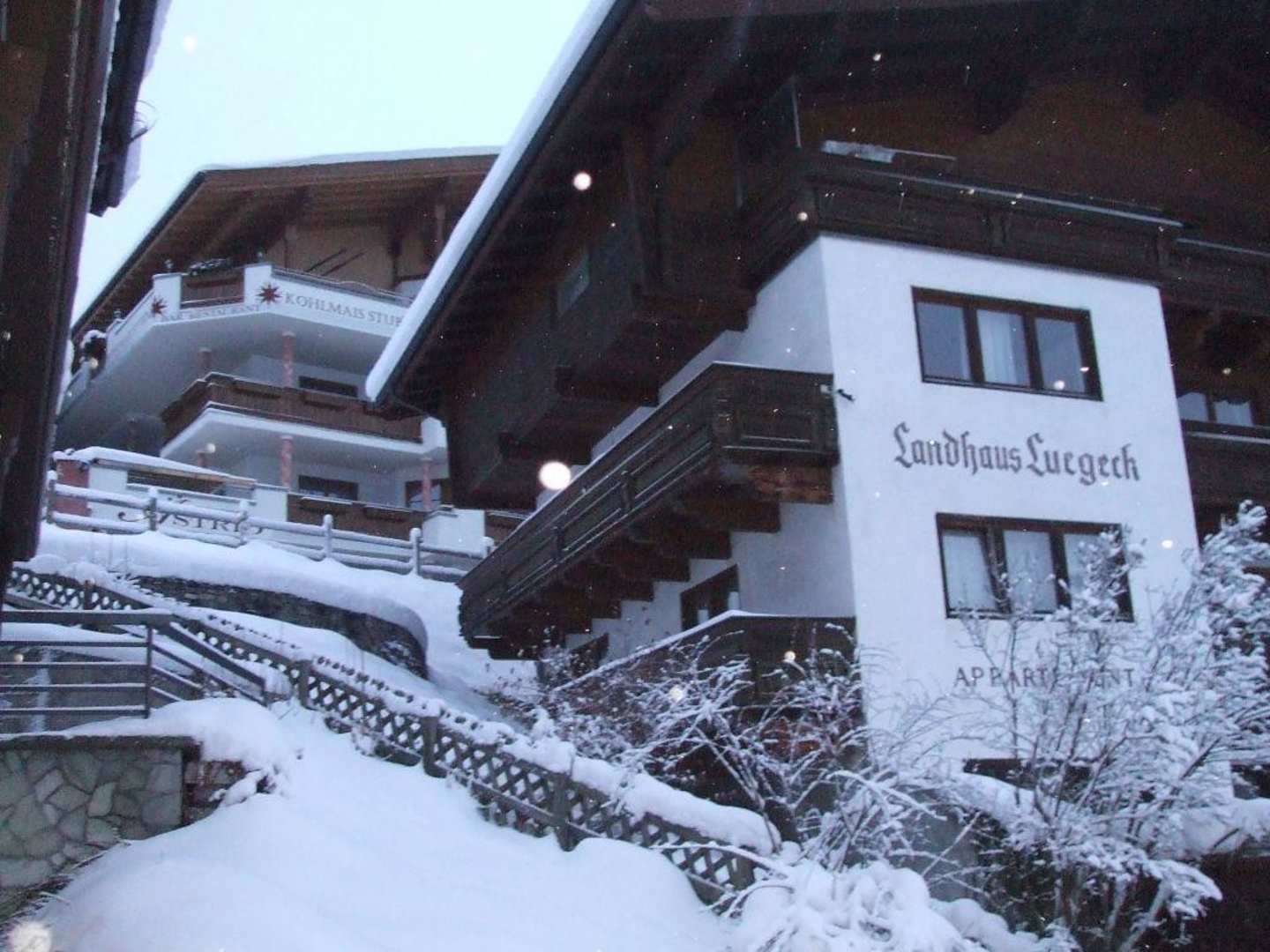 Blick von einer Terrasse im Hapimag SaalbachDiese Aufnahme entstand am 20. Dezember 2008 und zeigt einen Ausblick von der Terrasse von Appartement 1 im Hapimag Saalbach nach Norden. Oben sieht man noch ein Stück der "Kohlmais Stubn". Bis dahin kann man auf Skiern abfahren und braucht dann nur noch eine Treppe "'runterzustiefeln". Also ideal für Skiläufer!